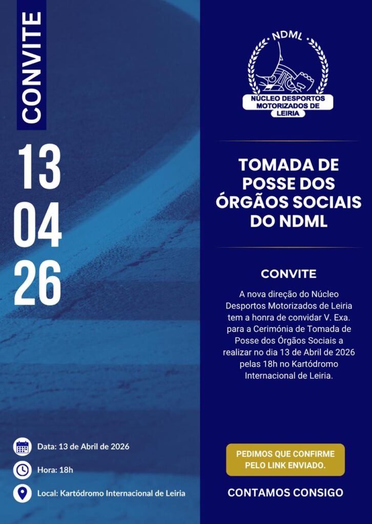 O Núcleo Desportos Motorizados de Leiria tem a honra de convidar para a Cerimónia de Tomada de Posse dos Órgãos Sociais, que terá lugar no dia 13 de Abril, pelas 18h00, no Kartódromo Internacional de Leiria.
