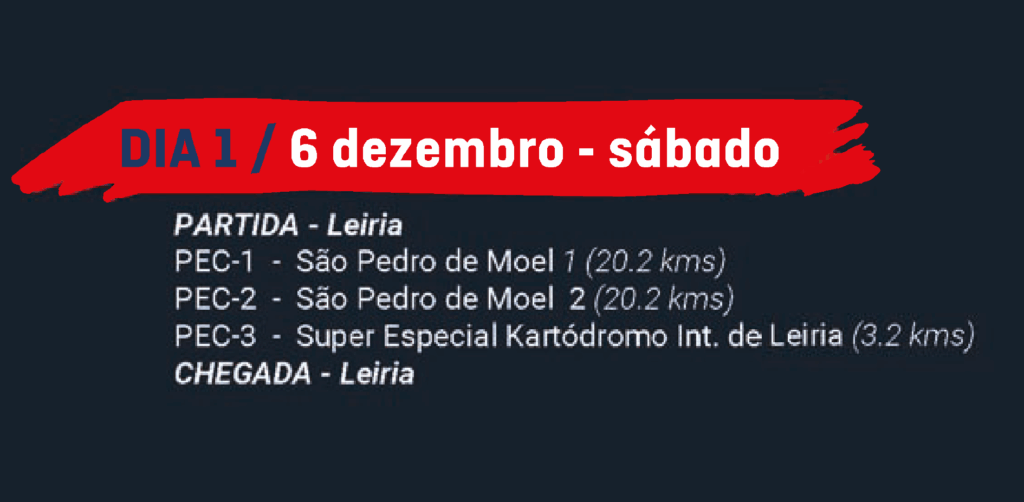 No sábado 06 de dezembro (3 especiais) passagem dupla pelos 20,2 km de São Pedro de Moel (às 15h00 e 17h00). E o dia encerra na Super Especial do Kartódromo Internacional de Leiria com 3,2 km, pelas 21h30.
