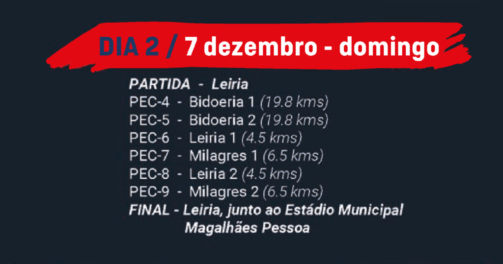 No domingo 07 dezembro (6 especiais) passagens duplas pelos 19,8 km da Bidoeira (às 09h30 e 11h30), pelos 4,5 km de Leiria (às 15h10 e 16h40) e pelos 6,5 km dos Milagres (às 15h45 e 17h15). E Grande Festa de Consagração do Leiria Festival Rallye, como manda a tradição vai acontecer já noite, junto ao Estádio Municipal Dr. Magalhães Pessoa, no centro da cidade do Lis.